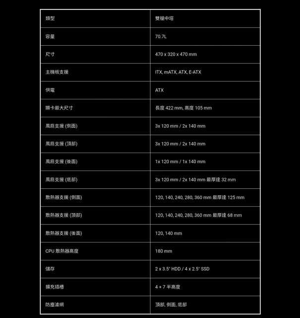 實際尺寸為 470 x 320 x 470 mm,內部空間最大可支援到 E-ATX 主機板。其周圍則是留有