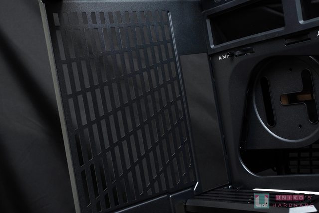 機殼另一側面板也可見大面積線條散熱網孔,此設計是對應側面風扇進氣和後方電源艙的進
