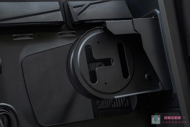 左側則是用來提供給機殼後方的散熱空間,最大可支援 140 mm x1 風扇,玩家可自由選擇