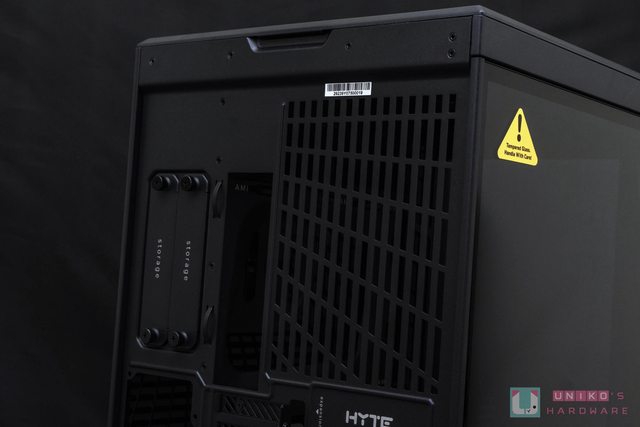 機殼後方上半部是前文提到的後方 140 mm 散熱空間、主機板 I/O 位置和懸浮 SSD / HDD