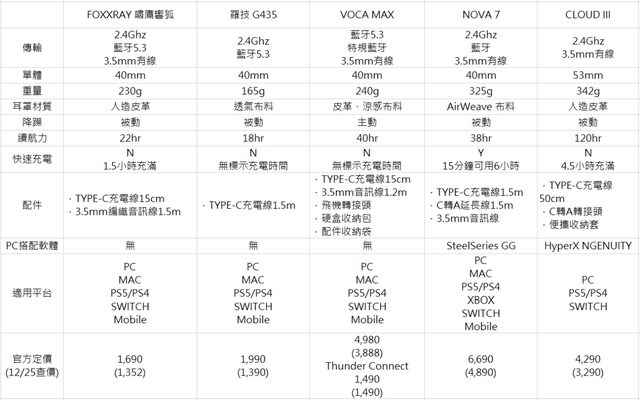 本次無線耳麥照個人隨心所欲順序排列分別是FOXXRAY 嘯鷹響狐、羅技 G435、Hyper X