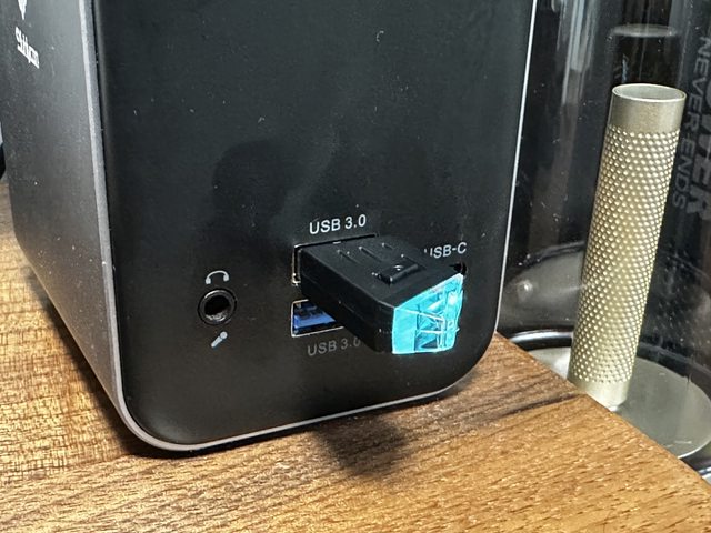 接收器設有配對按鈕,在連接上耳麥時為淡藍色長亮燈效,配對時燈號則會閃爍。