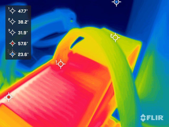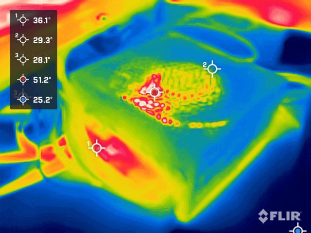 在壓力測試進行約 30 分鐘時使用熱成像儀觀察 LEADEX VII XG 850W 發熱情況