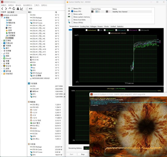 雙烤時CPU最高為91度,核心平均84.625度,顯示卡核心57度、熱點68度、記憶體56度,