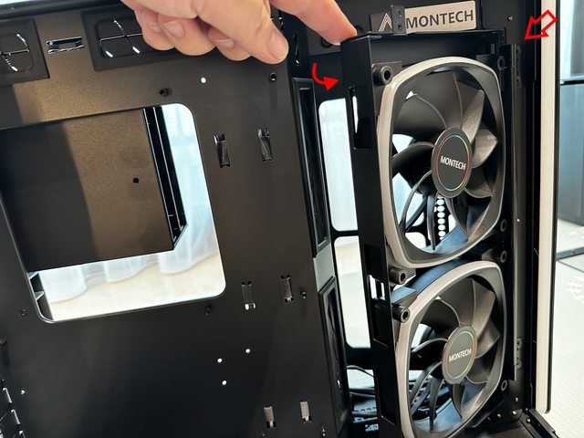 風扇架轉至前方後就能裝回最前方底部風扇,目測不會干涉但也只剩一咪咪的距離。