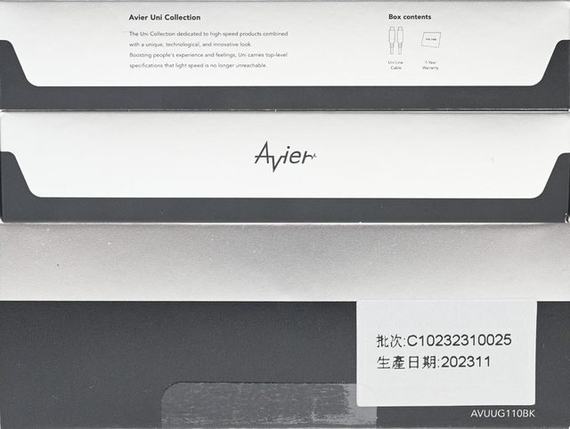 ▼外盒左側面有Avier Uni Collection系列簡介及包裝內容,外盒右側面有商標,外盒底