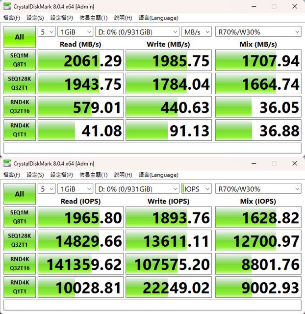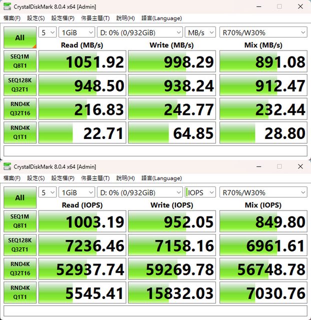 ▼主機板USB3.2 Gen2埠經線材連接SAMSUNG T7 1TB外接式SSD的CrystalDiskMark預設