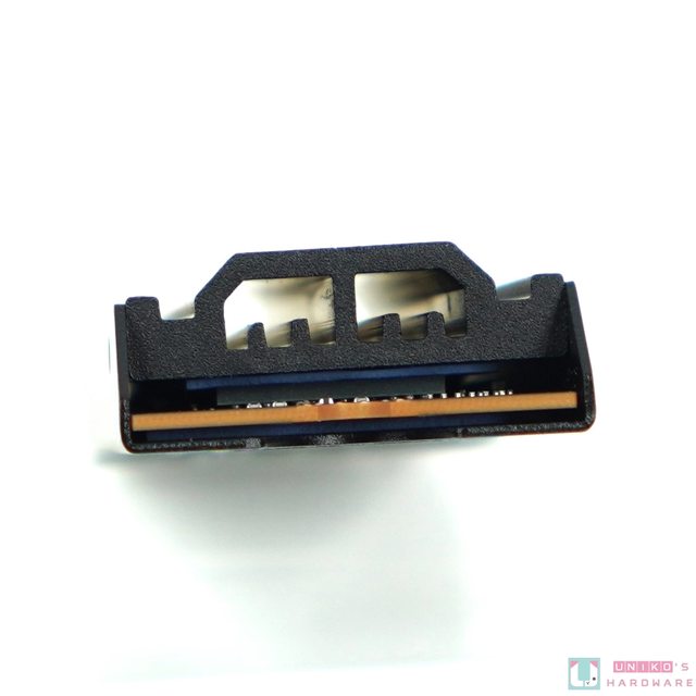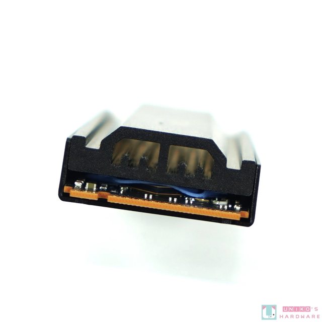 從兩端看進去,可以看到 SSD 兩面都貼有導熱墊,讓熱量確實傳導到散熱器上,並且散熱