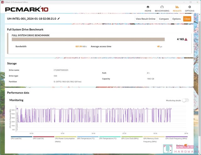 PCMARK Full System Drive Benchmark 儲存裝置測試,測得頻寬 661.94 MB/s、平均存取