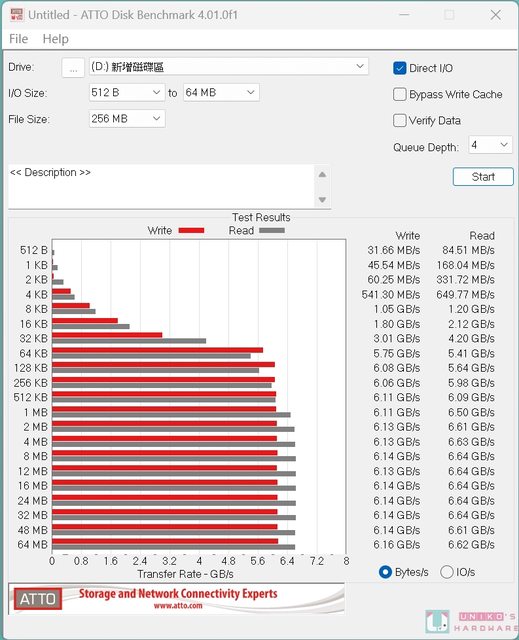 ATTO Disk Benchmark 4.01,寫入最高 6.16 GB/s、讀取最高 6.64 GB/s,IO 讀取區塊 51
