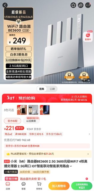 推 yurian: 比ax3000t貴70rmb 多了些wifi7的功能 去 1.34.110.18 02/01 01:48