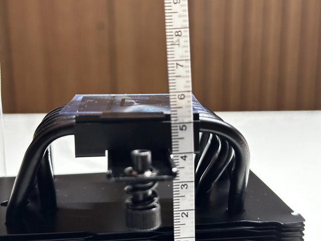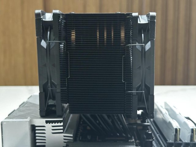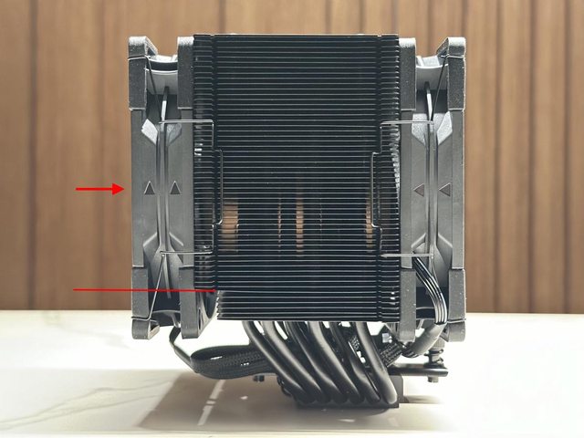 裝上散熱器並掛上風扇,單塔加上避讓設計,對前方記憶體幾乎是零干涉,後方風扇在個