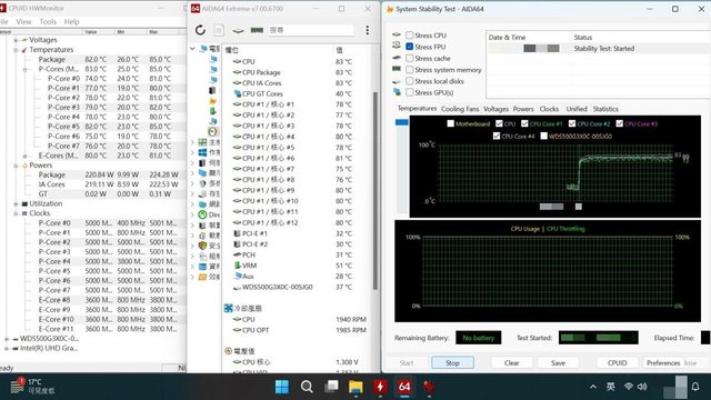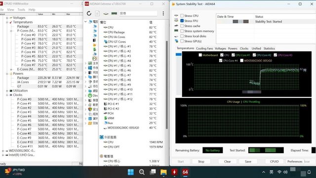 中Package三次測試平均為84.3度、各P核心三次測試平均為80.92度,噪音在距離散熱器
