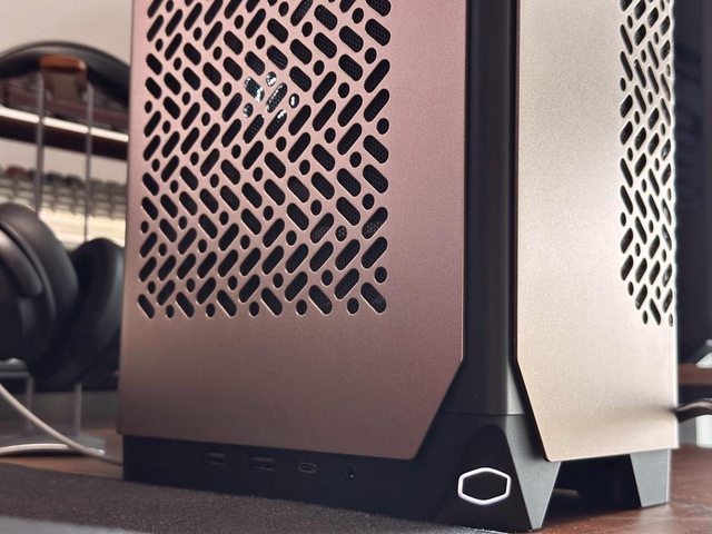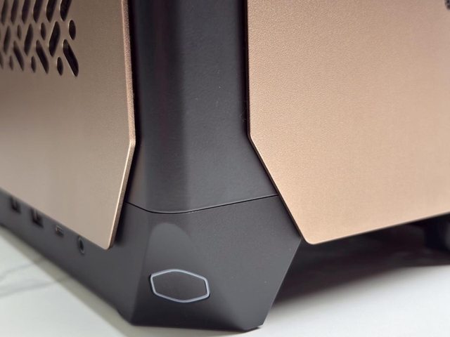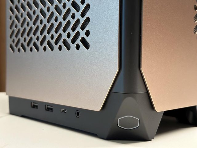 酷碼LOGO形狀的電源及前置接口位於機殼左前下方,為2xUSB-A+1xTYPE-C+1x3.5mm複合音