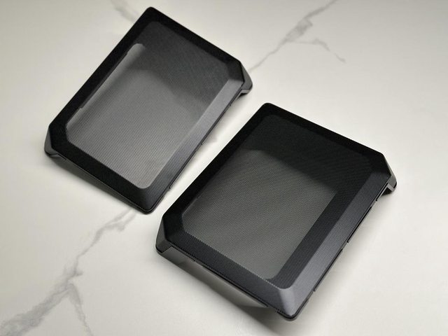 機殼外側為細緻紋路的鋁合金彎折面板,搭配大面積的通風開孔,外觀看不到任何螺絲,