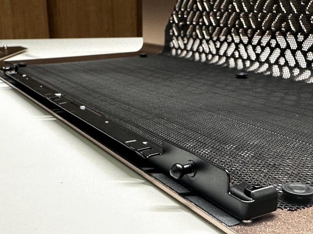 面板四角皆以卡扣固定,其中一側內部搭配黑色金屬條增加固定穩定性。