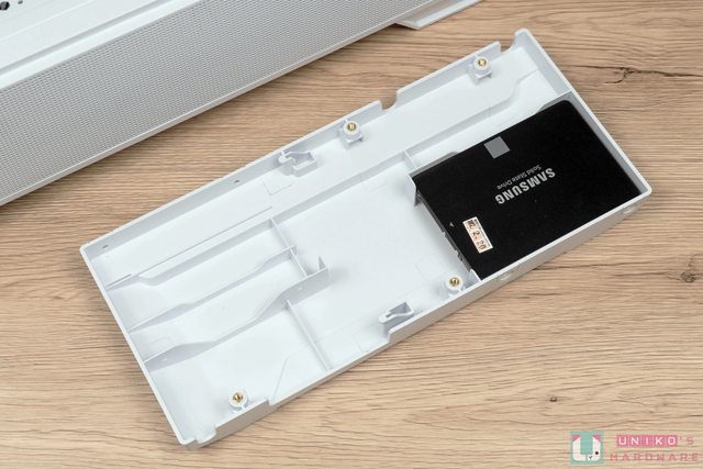 視覺上最特別的是位於側面的裝飾儲存面板,預設可安裝 2 顆 2.5” 硬碟,拆卸後最大