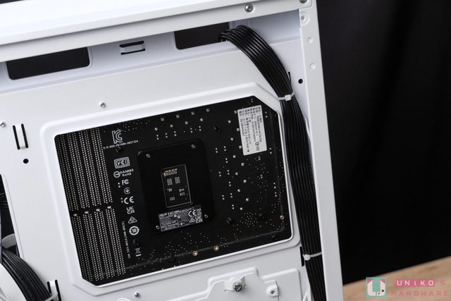 手動整理一下線材。另外,主機板處理器腳位區域保留大面積鏤空方便更換散熱器使用,其