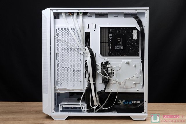 筆者用束帶簡單整個線,視覺上看來還算乾淨,理線區設計得不錯,主機板 CPU 所需 PCIe