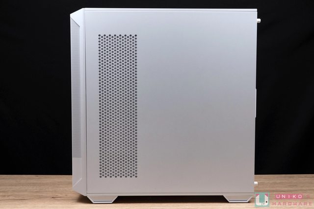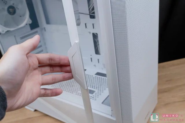 透側面板下方,電源艙外側延續正面網狀散熱的設計語言,透側面板有磁吸式把手,稍微施