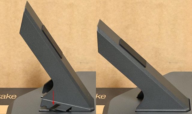 ▼從底座背面看,確認支撐架兩側卡榫要完全扣住底座孔洞兩側(紅色箭頭)