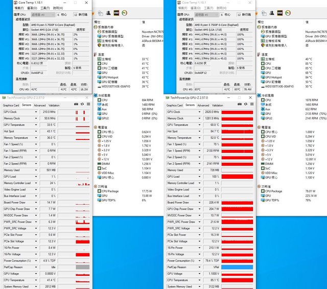 ▼平躺放置CPU+GPU高負載前(左)及高負載30分鐘後(右)的Core Temp、GPU-Z感測器、
