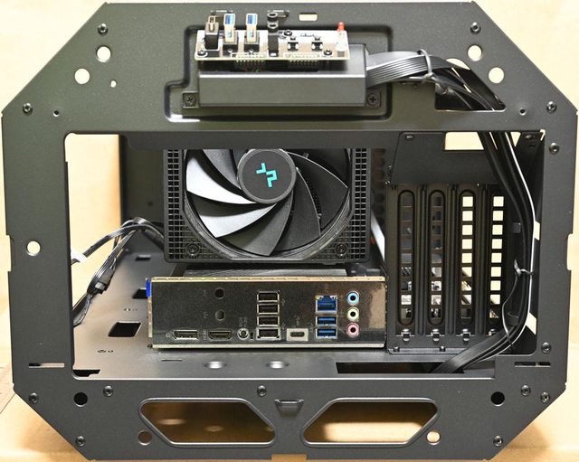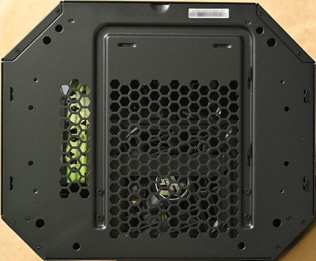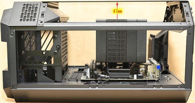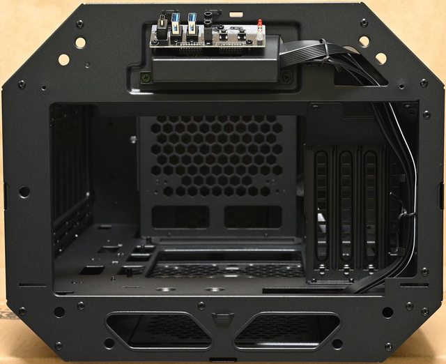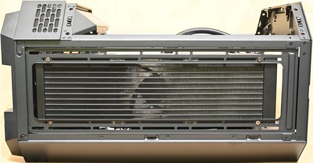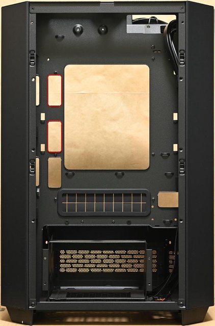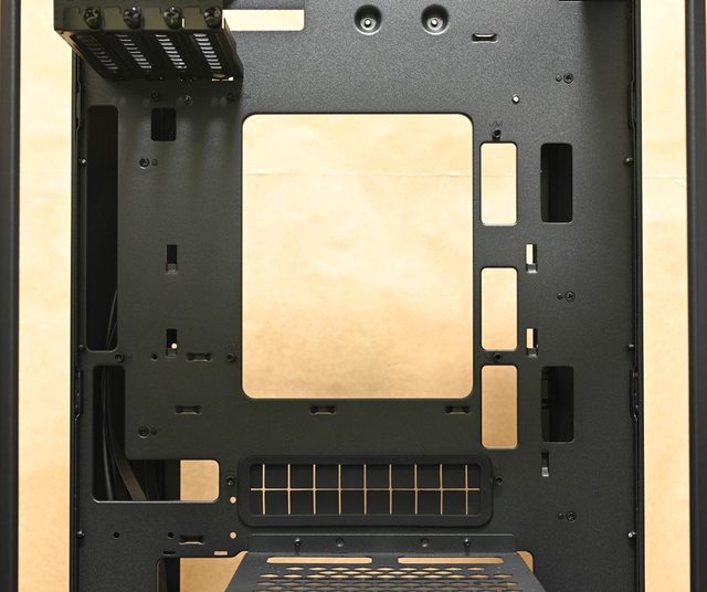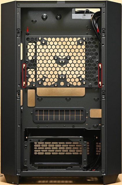 ▼取下機殼頂部風扇固定板後的內部圖,靠近後方處(圖片下方)設置2個穿線開口