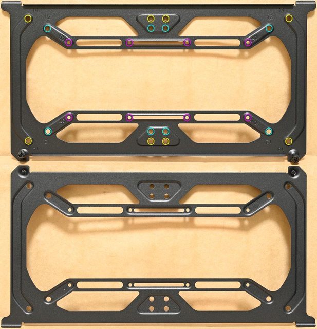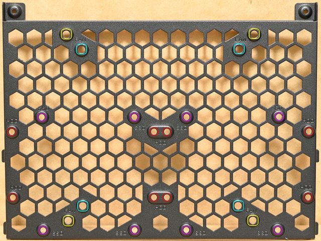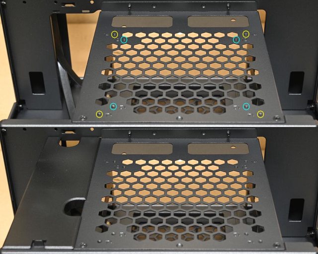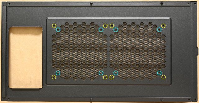 ▼頂部風扇固定板可安裝2個120mm(水藍色孔)/140mm(黃色孔)風扇,並額外配置2個2.5吋