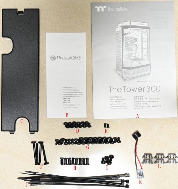 電源螺絲(I)、塑膠束帶(J)、蜂鳴器(K)、備用卡榫卡扣(L)