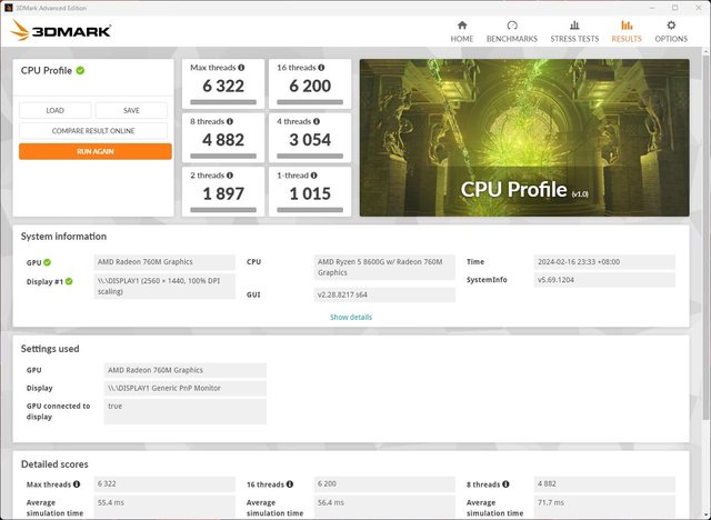 3DMARK CPU Profile 全執行緒的成績為 6322 。