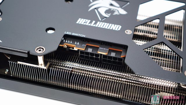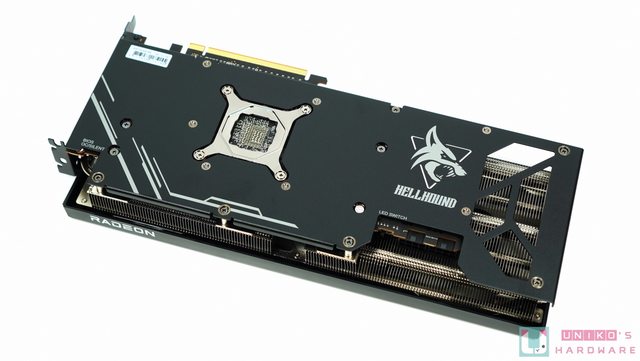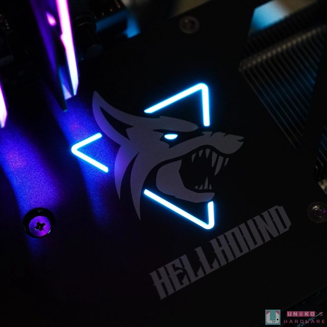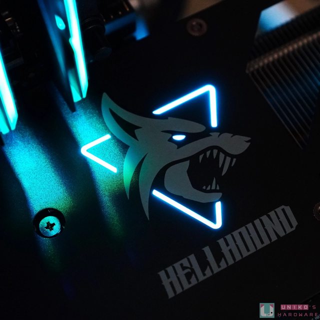 顯示卡金屬強化背板,在 HELLHOUND 圖案的眼睛與三角框框透出 RGB,並與前方風扇連動