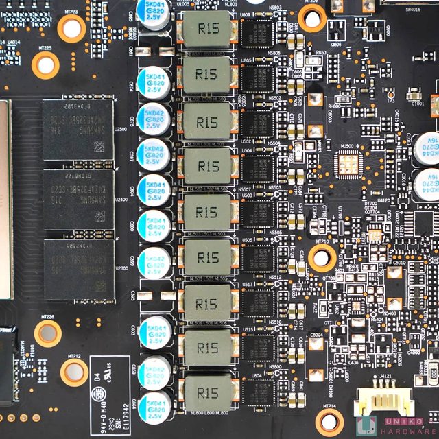 SAMSUNG K4ZAF325BC-SC20 每顆容量為 2GB,原生速率達 20 Gbps,8 顆 GDDR6 合共組成