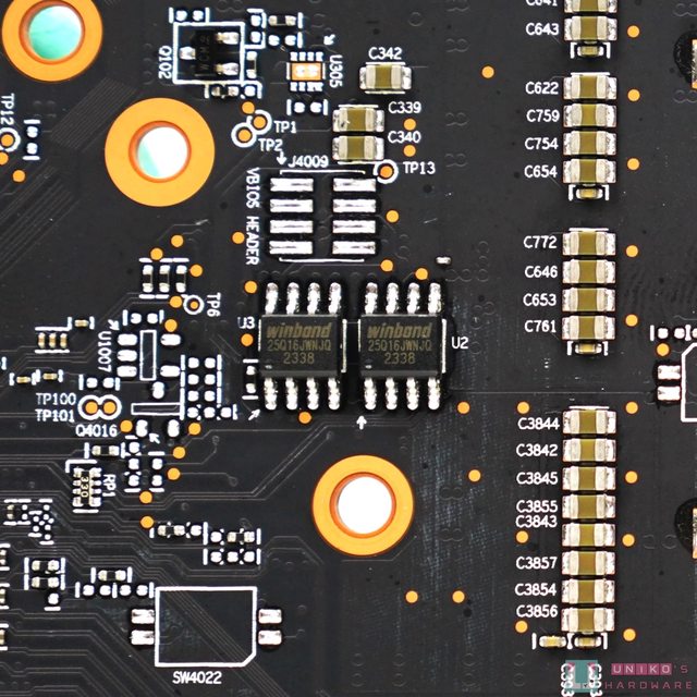 背面除了看到雙 BIOS 晶片,也看到高階 RDNA 3 的供電設計所需要的 3 顆 PWM 供電控制