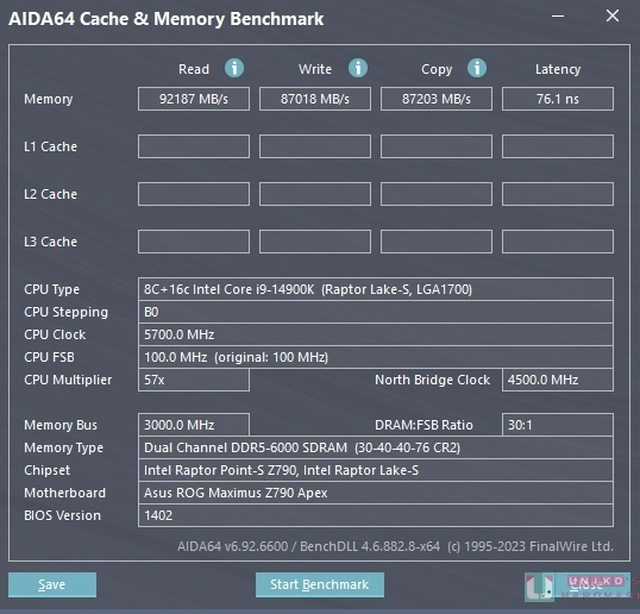 92187 MB/s、寫入 87018 MB/s、複製 87203 MB/s、延遲 76.1 ns,延遲就很明顯地變低