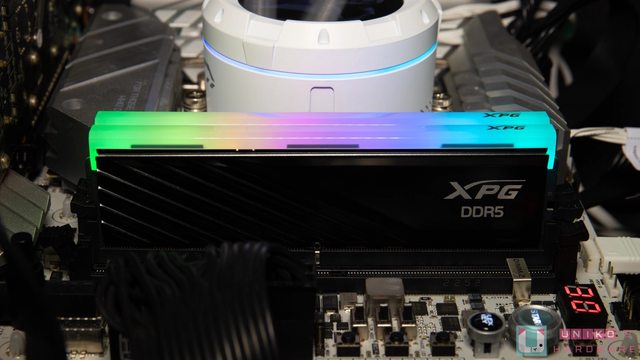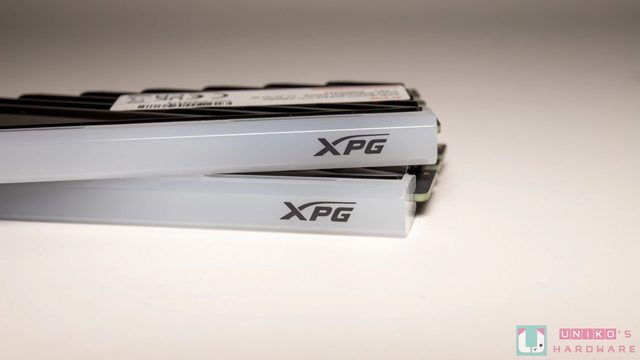 射雕刻 XPG DDR5 字樣,設計上走低調簡約風。散熱片上方導光條右側印有 XPG 字樣,主