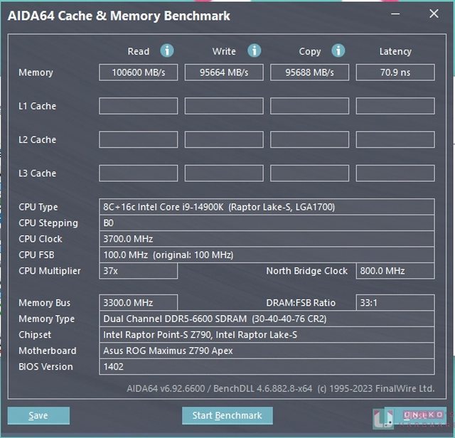 度 100600 MB/s、寫入 95664 MB/s、複製 95688 MB/s、延遲 70.9 ns, 既然這麼穩定,