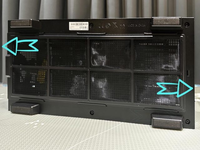 前後一次講完,前面板也是整片方正通風開孔,內部設有可拆的磁吸尼龍濾網,後方則可