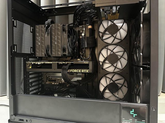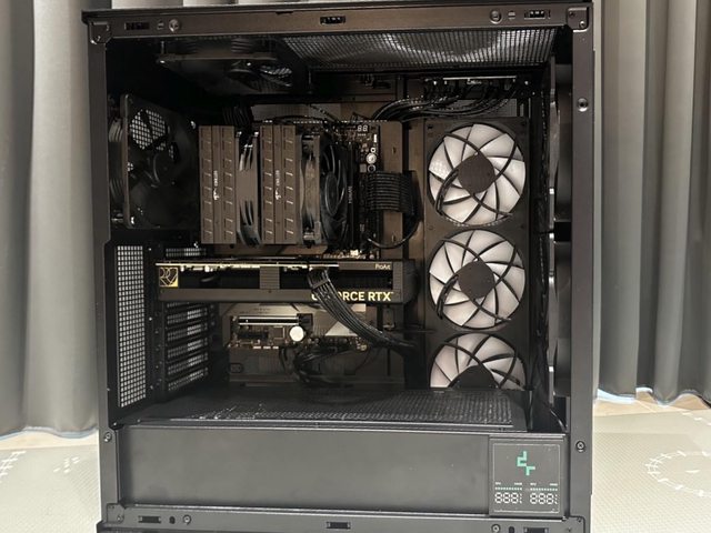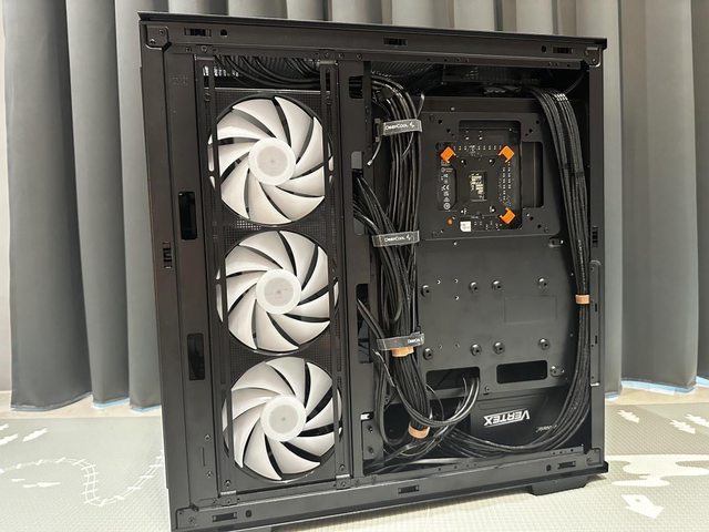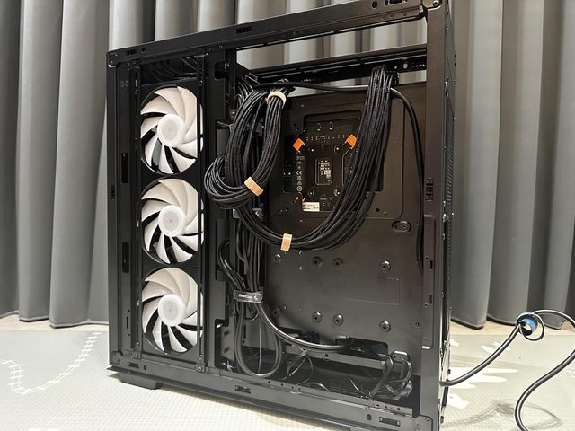 所有貓頭鷹風扇安裝完成,暫時先用標準電源下置模式,加上側邊14cm三連風扇共9顆風
