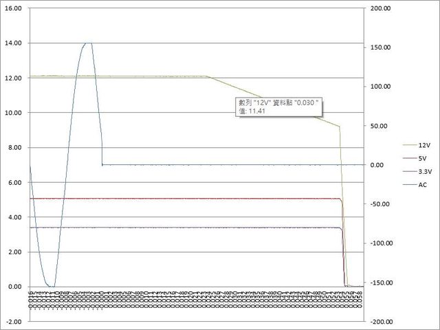 ○綜合全負載輸出狀態切斷AC輸入模擬電力中斷,12V於24ms開始壓降,30ms降至11.41V