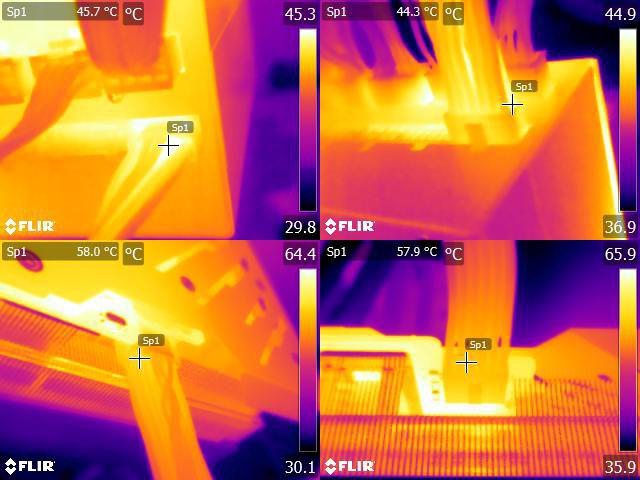 ▼執行FURMARK 30分鐘後電源端插頭(左上/右上)及顯示卡端插頭(左下/右下)的紅外線熱