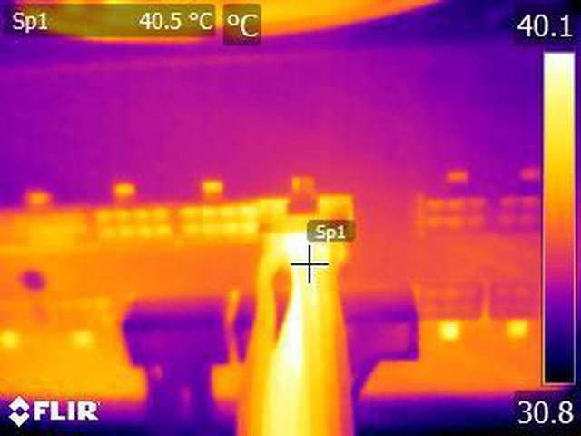 ▼單條EPS 8P連續輸出28A(336W)10分鐘後的電源端模組化接頭紅外線熱影像圖(附註:安