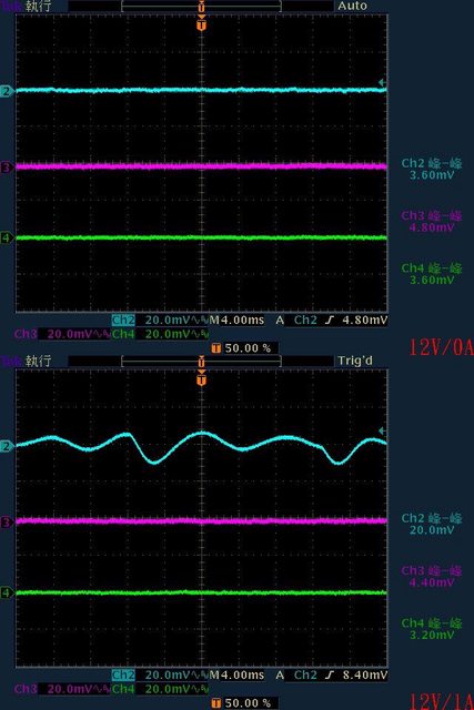 ○輸出無負載時12V無明顯漣波,輸出12V/1A時有最大12V漣波,輸出12V/7A時12V無明顯