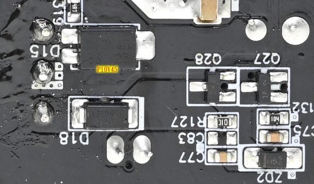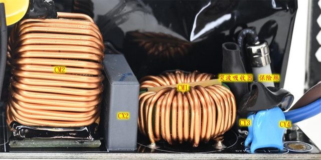 ▼主電路板上有2個共模電感(CM1/CM2)、1個X電容(CX2)及2個Y電容(CY3/CY4),直立安裝