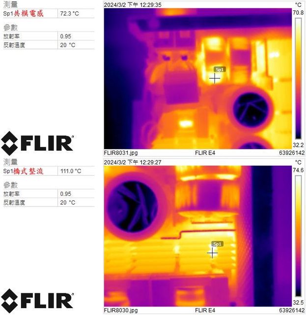▼110V輸入時電源供應器滿載輸出下APFC電感/APFC散熱片(上圖)及APFC DIODE(下圖)的