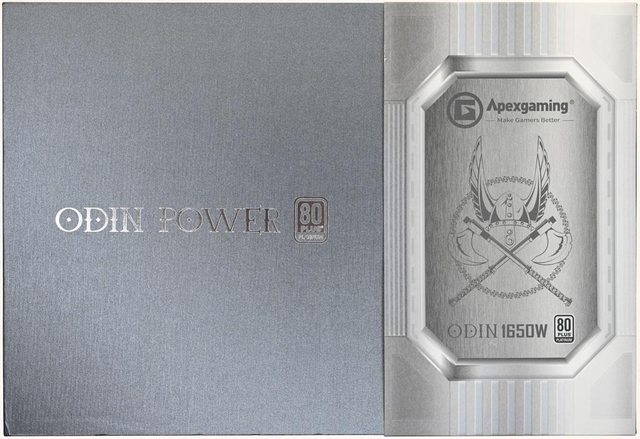▼彩色印刷外套頂部有Apexgaming商標/標語、ODIN POWER字樣、輸出功率、80PLUS白金