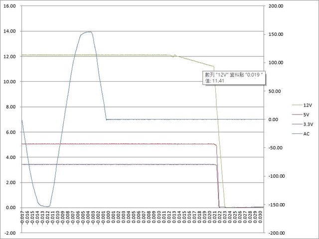 ○110V輸入下3.3V/16A、5V/16A、12V/120A輸出狀態切斷AC輸入模擬電力中斷,12V於