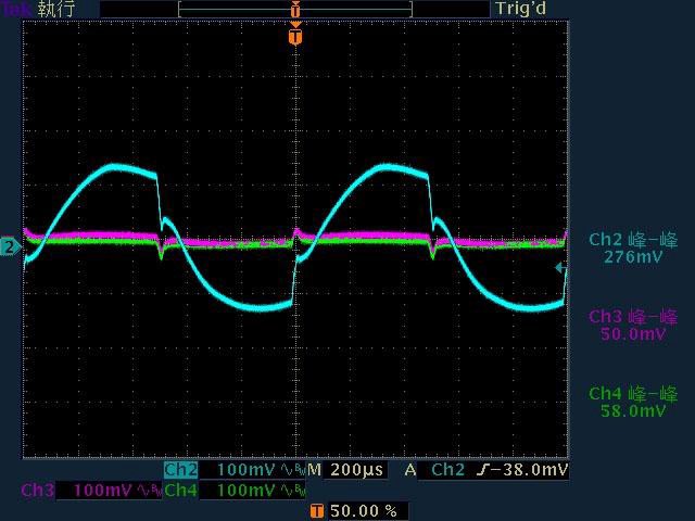 ○110V輸入下輸出無負載時12V無明顯漣波,輸出12V/1A至12V/4A時12V帶有較大間歇漣波