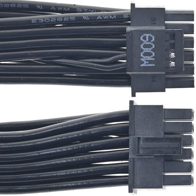 ▼1條電源端2個8P模組化插座轉12VHPWR黑色帶狀模組化線路,接頭標示600W,16/28AWG