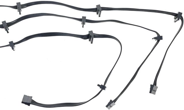 ▼3條SATA黑色帶狀模組化線路,提供9個直角SATA接頭及3個直式SATA接頭,至第一個接