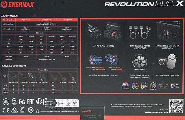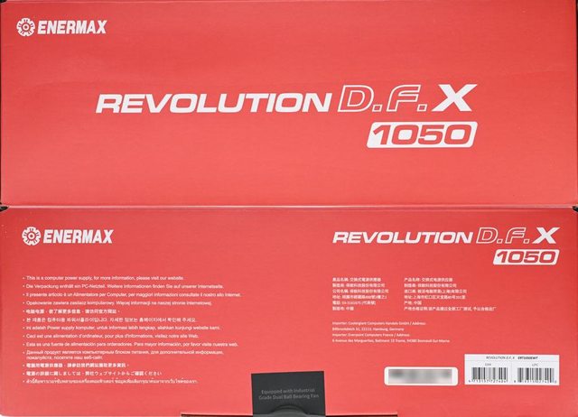 ▼外盒背面有ENERMAX商標、REVOLUTION D.F. X名稱、850/1050/1200機種輸入/輸出規格